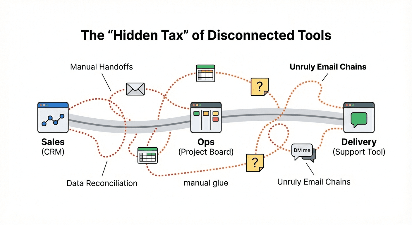 Most tools might feel fine inside one function (sales, ops, delivery). But the pain appears when work crosses boundaries: